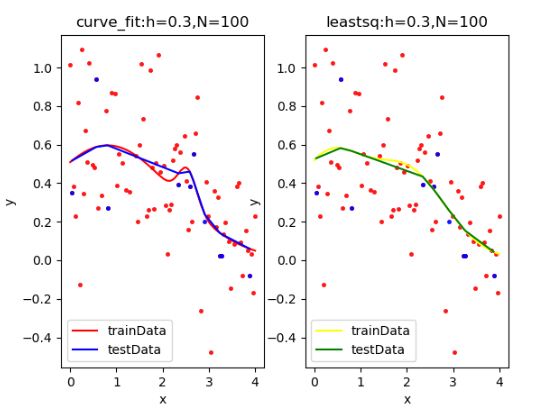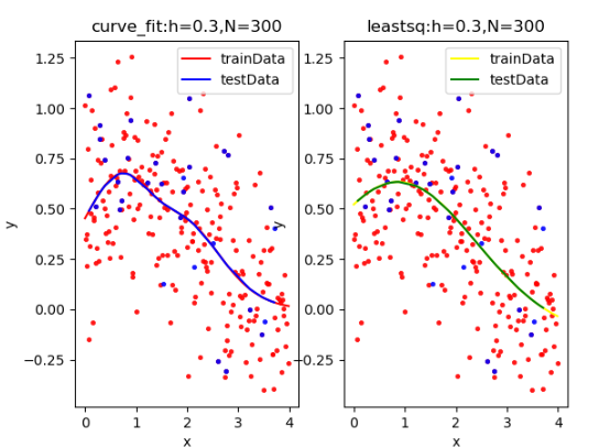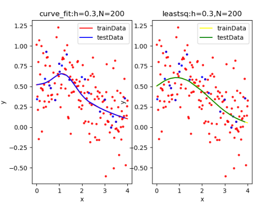 | curve_fit拟合: [ 0.2408062 2.91612327 1.23109954 -0.03553431 0.45438827 2.25150756] rmseTrain: 0.2761896128805953 rmseTest: 0.17399649531553602 leastsq拟合: [ -2.17240752 10.4348742 0.87428228 -30.76492902 -1.42103926 -0.97720794] rmseTrain: 0.27848961091065344 rmseTest: 0.1737385154786153